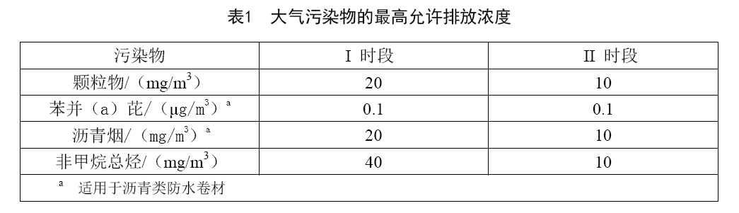 瀝青類防水卷材生產(chǎn)過程中,生產(chǎn)線以單位產(chǎn)品重量核算的瀝青煙排放總量執(zhí)行表2規(guī)定。