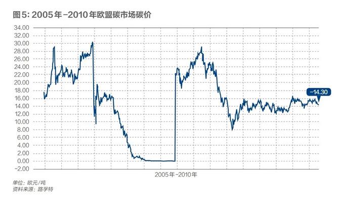 歐盟碳交易起始價較高,2005年初從15歐元/噸價位迅速上漲到28歐元/噸。但在2006年4月底,由于核查排放數(shù)據(jù)泄露,并顯示發(fā)放給成員國的碳配額總數(shù)遠(yuǎn)高于實(shí)際排放,碳配額嚴(yán)重過剩。導(dǎo)致每噸碳價從30歐元暴跌至10歐元。此后,由于配額不能存儲到下一階段導(dǎo)致碳價繼續(xù)暴跌,到2007年底接近零。