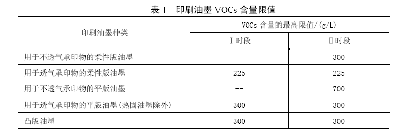 印刷企業(yè)生產過程中使用的印刷油墨VOCs含量限值(為處于即用狀態(tài)以每升油墨所含多少克VOCs計算)應執(zhí)行表1的規(guī)定。