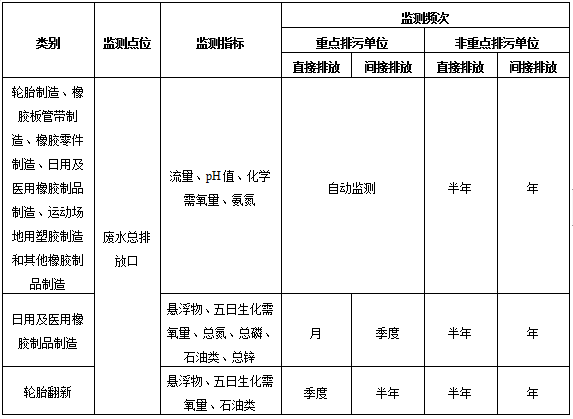 表1橡膠制品工業(yè)排污單位廢水排放監(jiān)測點位、監(jiān)測指標及最低監(jiān)測頻次