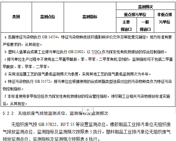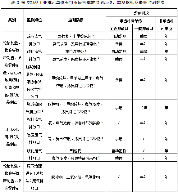 5.2.1.2橡膠制品工業(yè)排污單位有組織廢氣排放監(jiān)測點位、監(jiān)測指標及最低監(jiān)測頻次按照表3執(zhí)行。